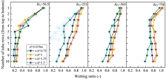 For d = 0.016 m, the wetting ratio ranges of the tenth row relative to the first row under different tube spacings are 25~60%, 50~68%, 68~75%, and 70~86% at Rel = 50.5, 253, 505, and 758, respectively; for d = 0.019 m, the corresponding ranges are 19~28%, 33~53%, 56~65%, and 63~81%; for d = 0.025 m, they are 11~25%, 33~43%, 52~68%, and 83~92%. For all three d values, as Rel increases, the tenth-row/first-row wetting ratio percentage gradually increases (e.g., shrinkage rate decreases). This is because low flow rates prevent full tube wetting: viscous force, gravity, and surface tension reduce the flow reaching lower rows, lowering the wetting ratio. High flow rates increase the lower-row flow and enhance the upper-row liquid disturbance to the lower-row liquid films, promoting spreading and reducing shrinkage relative to the first row.