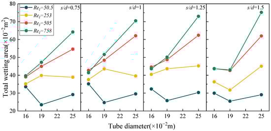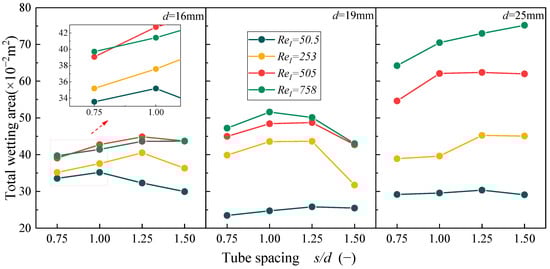 Figure 8 illustrates the variation of the total wetting area outside 10-row tubes with the tube spacing (reflecting the test section’s overall wettability). As the tube spacing increases, the total wetting area either first rises then falls or increases continuously; the area at s/d = 0.75 is relatively small. This is because a small s/d value limits the time fluid is affected by gravity and surface tension, resulting in insufficient dynamic potential energy, with weak impact/disturbance on the lower-row tube-top liquid film prevents full axial spreading. When s/d = 1 or 1.25, the total wetting area mostly peaks (good external wettability). Moderate spacing allows for fluid to fall in a more dynamic potential energy via longer gravity action; the disturbance increases but splashing is minimal, with nearly all fluid impacting the lower-row tube tops, promoting rapid axial spreading of the lower-row liquid film and optimal overall wetting. When s/d further increases to 1.5, for small diameters (d = 0.016 m, 0.019 m), the total wetting area decreases—excessive spacing leads to excessive fluid dynamic potential energy, causing more splashing after droplet impact on the lower rows and reducing the fluid effectively participating in the external falling film. For a large diameter (d = 0.025 m), the total wetting area remains nearly constant or even increases—a larger d value reduces the liquid film thickness and, under the same dynamic potential energy, the impact on the lower-row thin film is stronger, promoting wetting area spreading.