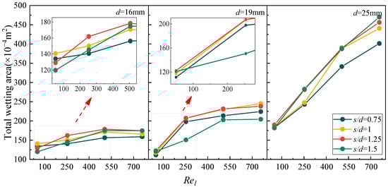 Meanwhile, the influence of tube spacing on the total wetting area varies with the flow patterns. For the droplet flow (Rel = 50.5), droplets are independent with weak mutual disturbance, and the total wetting area is mainly affected by the liquid flow rate, with insignificant tube spacing influence. For d = 0.016 m, 0.019 m, 0.025 m, the absolute variation ranges of the total wetting area with tube spacing are 16.7%, 10.3%, 5.4%, respectively—the tube spacing influence weakens with the increasing d. For the columnar flow (Rel = 253), the liquid column impact on lower row is stronger than the droplet flow; the increased tube spacing intensifies the liquid column dynamic potential energy change, promoting lower-row wetting and exerting more obvious influence on the total wetting area. For the three d values, the variation ranges are 15.7%, 37.7%, and 16.3%, respectively—the tube spacing influence first increases then decreases with d, peaking at d = 0.019 m. For the sheet flow (Rel = 758) for the three d values, the variation ranges of the total wetting area with the tube spacing are 10%, 20.8%, 17.1%, respectively—compared with the columnar flow, the tube spacing weakens as the flow rate further increases. Additionally, for all three d values, the total wetting area mostly increases with Rel regardless of the tube spacing. From the partial enlarged view, only when d = 0.016 m and s/d = 1.0, 1.25 is the total wetting area at Rel = 505 larger than that at Rel = 758.
