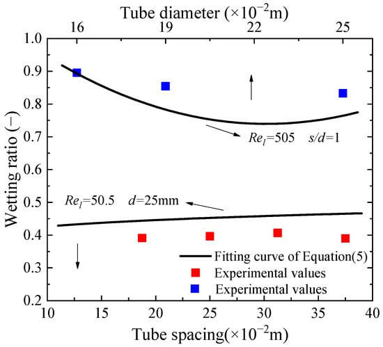 In practical engineering, to ensure the optimal wetting ratio (η), according to the summarized formula, the most appropriate operating conditions are Rel = 758, the tube diameter d = 25 mm, and the tube spacing s = 37.5 mm, and the wetting ratio reaches its maximum value of 88%.