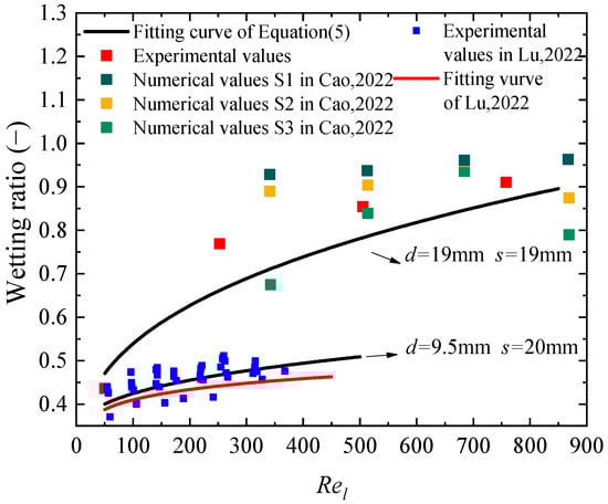 To verify the accuracy of Equation (5), the calculated values were compared with this study’s experimental results, which shows the wetting ratio variation with d and s under the same working conditions (Figure 11). With an average error < 10%, the equation’s predictions agree well with experimental results. Equation (5) was compared with the simulation data from Reference [34] and the experimental data from Reference [31] (Figure 12). A comparison with the numerical simulation results of Cao et al. [34] indicates that Equation (5) accurately predicts the wetting ratio variation trend with Rel, with an average error of 14%. A comparison with the experimental results of Lu et al. [31] (20 tube rows, so ε = 0.35 for Equation (5)) shows an average error < 8%, confirming good agreement with the simulation and experimental results in the literature.
