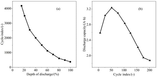 The influence from the battery discharge depth on the cycle index [12] (service life), as shown in Figure 1a, was emphatically evaluated and the lead–acid battery was selected as an example in this work. Meanwhile, the coupling relationship between the cycle index and battery capacity decline is also presented (Figure 1b), which can be used as a basis to determine whether the parameter setting of the battery can meet the actual demand. Their correlation emerged when the cycle index showed a significant downward trend with the increasing discharge depth, and its mathematical relationship can be well fitted with a polynomial function. This provides a theoretical basis for the design and optimization of the discharge depth, and it even includes the design of the discharge depth under multiple cycles. The set capacity in this work is based on the peak value, and this is because the increase in its capacity at an early stage belongs to the activation process of the battery, which is shown in the relation curve between the discharge capacity and cycle number. The recession of the battery discharge capacity can be described by segmentation fitting this curve, which provides the design basis for the replacement rule of batteries. It can be observed that the capacity of the battery undergoes a significant decline with the increase in the number of cycles. However, in order to meet the regulation requirements over a long period, enterprises have to increase the initial capacity to meet the demand for a longer margin. Based on this, this work implements the updated strategy of new and old batteries to maintain the regulation margin at a relatively low level, thereby achieving the goal of cost reduction.