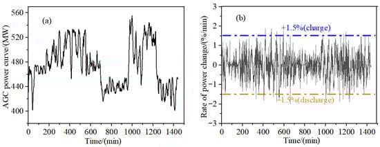 The 660 MW coal-fired unit is chosen as the research object in this work. Automatic generation control (AGC) command of a certain day (1440 min) is chosen as the basic data, and its power curve is shown in Figure 2a. The peak-valley difference in the AGC command is an important reference index for depth-peak regulation, and the change rate of its power is also another reference index to evaluate its FM demand. Therefore, the rates of power change were calculated, as shown in Figure 2b. It can be found that the auxiliary regulation is required when the rate of power change is set to 1.5%/min. Taking the auxiliary regulation of the battery as an example, the battery needs to start 28 times in a day (including 19 times to charge, 9 times to discharge). In the following, these 28 adjustments are carried out to optimize the charging and discharging process of battery.