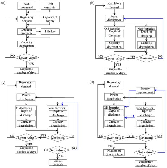 According to four optimization scenarios of the battery replacement strategy, corresponding logical operation relationships were set in this work (as shown in Figure 3). It should be noted that since different scenarios require different calculation logics, Figure 3 has been divided into four parts for this purpose. First, the battery capacity and the duration day are calculated to assess the impact of the discharge depth in the replacement strategy, and its logical operation relationship is shown in Figure 3a. The calculation process is as follows: according to AGC instructions and unit constraints, the battery regulation demand is obtained. On this basis, the discharge depth at each time point is calculated by combining the set battery capacity, and the battery life loss and capacity decay are successively calculated. Further, as to whether to start again, the adjustment needs to be determined by comparing the lower limit of the battery capacity. When the lower limit is reached, the cycle ends, and the output lasts for several days. Second, the adjustment power distribution of old and new batteries has been optimized, and the logical operation relationship was shown in Figure 3b. Its characteristic is that the power distribution of the old and new battery is added under the condition of the original battery adjustment demand, and the optimization principle of this power allocation is the maximum number of days of old and new battery synchronization. Finally, the equal-day replacement strategy (shown in Figure 3c) and the equal-capacity replacement strategy (shown in Figure 3d) were calculated, respectively. Among them, the characteristics of the equal-day replacement strategy are to find the battery replacement capacity under the design value of equal days by the iterative method, and correspondingly, the characteristics of the equal-capacity replacement strategy are to find the single days and cumulative days under the same battery capacity by the iterative method.