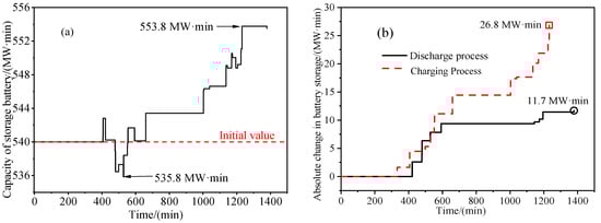 Figure 4a showed the fluctuation curve of the storage battery in one day, and its initial capacity is set as 540 MW·min. It can be found that the minimum capacity is 535.8 MW·min and the maximum capacity is 553.8 MW·min. Results showed that the battery capacity can meet the regulatory capacity requirements during the actual operation process when it is 18 MW·min. For batteries with an initial capacity of 540 MW·min, the discharge depth is small. Therefore, the batteries would be grouped to achieve the purpose of reducing the initial investment and improving the operating life of the battery under the premise of meeting the existing unit adjustment capacity. Six capacity batteries, including 90 MW·min, 108 MW·min, 135 MW·min, 180 MW·min, 270 MW·min, and 540 MW·min, have been selected in this work. Figure 4b shows the capacity change in the battery during charging and discharging in one cycle (1440 min). It can be seen that after one day of operation, the capacity of the battery decreases to 11.7 MW ·min in the whole discharge process and increases to 26.8 MW ·min in the whole charging process. The capacity error of the charging and discharging process can be weakened through returning the capacity of the battery to its position in time, and thus, the service life of the battery would only be calculated according to the charging process in this work.