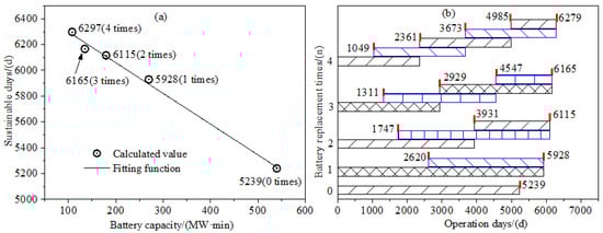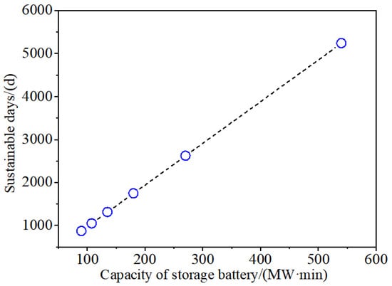 To further evaluate the mathematical association between the battery capacity and sustainable day, six groups of batteries (90, 108, 135, 180, 270, and 540 MW·min) were selected to calculate their sustainable day. During these calculations, the boundary condition is the attenuation of the battery capacity to 80% of the original capacity. Figure 5 shows a linear increase trend of battery sustainable days with the growth of the battery capacity, and meanwhile, the trend closes to a linear association, and there is a fixed proportion. This indicates that the calculated discharge depth of lead–acid batteries is not a major factor in their service life. It should be noted that the vertical axis represents the number of days for which the battery needs to be replaced regularly after reaching a certain capacity, and it does not represent the battery’s lifespan.
