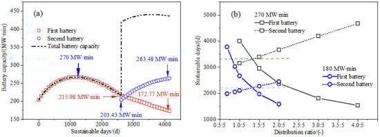 In order to study the replacement of new and old batteries as well as the proportion of power regulation during the replacement process, the change trend of the duration time and the capacity of new and old batteries are calculated [Figure 6a], and meanwhile, the optimization characteristics of the replacement ratios of new and old batteries under two examples (Figure 6b) are evaluated, respectively. Figure 6a showed the replacement process of 270 MW·min × 2 batteries, and the replacement time point is set as the capacity of the first battery, reduced to 80% of the rated capacity (215.98 MW·min). In the second cycle, the capacity of the first battery continues to decrease to 64% (172.77 MW·min) of the rated capacity. At this time, it is considered that the battery is no longer suitable for work. At the same time, the second battery also just reaches 80% (215.98 MW·min) of its rated capacity, which forms the basis for synchronous replacement between the old and the new. It is worth noting that there is an activation process for the battery, and 270 MW·min and 263.48·MW·min in Figure 6a are the maximum capacities achieved in the active state of the first and second batteries. It is not difficult to find that the initial value of the state is 203.43 MW·min; thus, the discharge depth and duration of days resulted in the peak capacity movement, which causes its different excited states. In this study, the capacity was set as the excited state peak in the first set of states (270·MW·min). How to realize the synchronous decline of old and new batteries is one of the basic problems of the battery replacement strategy, and the problem lies in the power distribution principle of old and new batteries. The relationship between the sustainable days and the distribution ratio of the old and new batteries are calculated by taking the capacity of two batteries (180 and 270 MW·min) as an example in Figure 6b. It can be found that with the increase in the capacity distribution ratio, the number of adjustable days of the first battery gradually decreased, and the number of adjustable days of the second battery gradually increased. The increase in the capacity distribution ratio of the first and second battery presents a completely different change pattern, which should be closely related to the battery decline curve itself. When the capacity distribution ratio is 1.3:5, the old and new batteries have consistent adjustable days, and it is found that this proportion is not closely related to the initial capacity of the battery. Therefore, the battery capacity distribution ratio is set at 1.3:5 in the subsequent calculation process.