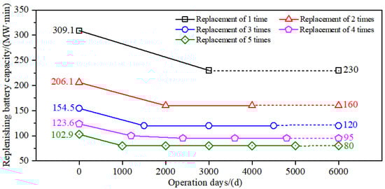 In order to detail the battery replacement characteristics, with the operation time of 6000 days as the termination cycle, the replacement strategy was evaluated with 1000 days (five times), 1200 days (four times), 1500 days (three times), 2000 days (two times), and 3000 days (one time) as the single-cycle time; the calculation results are shown in Figure 8. First, the supplementary battery capacity shows the same change pattern with the operating time, which tends to decrease first and then stabilize. Taking two replacements as an example, the first installed battery capacity is 206.1 MW·min, the first replacement battery capacity is 160 MW·min, and the second replacement battery capacity is 160 MW·min. The calculation results further confirm the importance of using the mid-way replacement of the battery. Secondly, for the replacement setting of 1~5 times, the initial input battery capacity is 309.1 MW·min, 206.1 MW·min, 154.5 MW·min, 123.6 MW·min, and 102.9 MW·min, respectively, which is close to linear correlation with the corresponding equal-day replacement. At the same time, it was found that the battery capacity provided after stabilization would be significantly lower than the initial value when the replacement strategy is adopted, which can realize the purpose of deeply excavating the old battery group.
