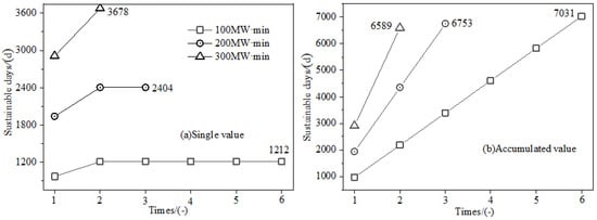 To quantitatively analyze the advantages of the equivalent-capacity replacement strategy, the replacement results of three battery capacities (100 MW·min, 200 MW·min, and 300 MW·min) are compared, respectively, which is shown in Figure 9. From Figure 9a, the duration day of the battery increase with the increase in battery capacity. And, meanwhile, for the batteries with the same capacity, the single duration day would increase with the replacement times, which presents a change rule of rising first and then stabilizing. This is consistent with the conclusion that the battery replacement strategy mentioned above can tap the potential of the battery application. It can be found from Figure 9b that, with the increase in battery replacement times, the total duration has an increasing trend, and the end is close to a straight line. Combined with the results from Figure 9a, the ratio of the replacement capacity to the last day varies little after the battery is stabilized. Therefore, the way to improve the battery capacity mainly lies in a single replacement process, which is related to the continuous operation of the two batteries after stability. In conclusion, through the periodic replacement of new and old batteries, the percentage of savings in battery costs can be easily calculated based on the number of replacements and the capacity of the batteries used.