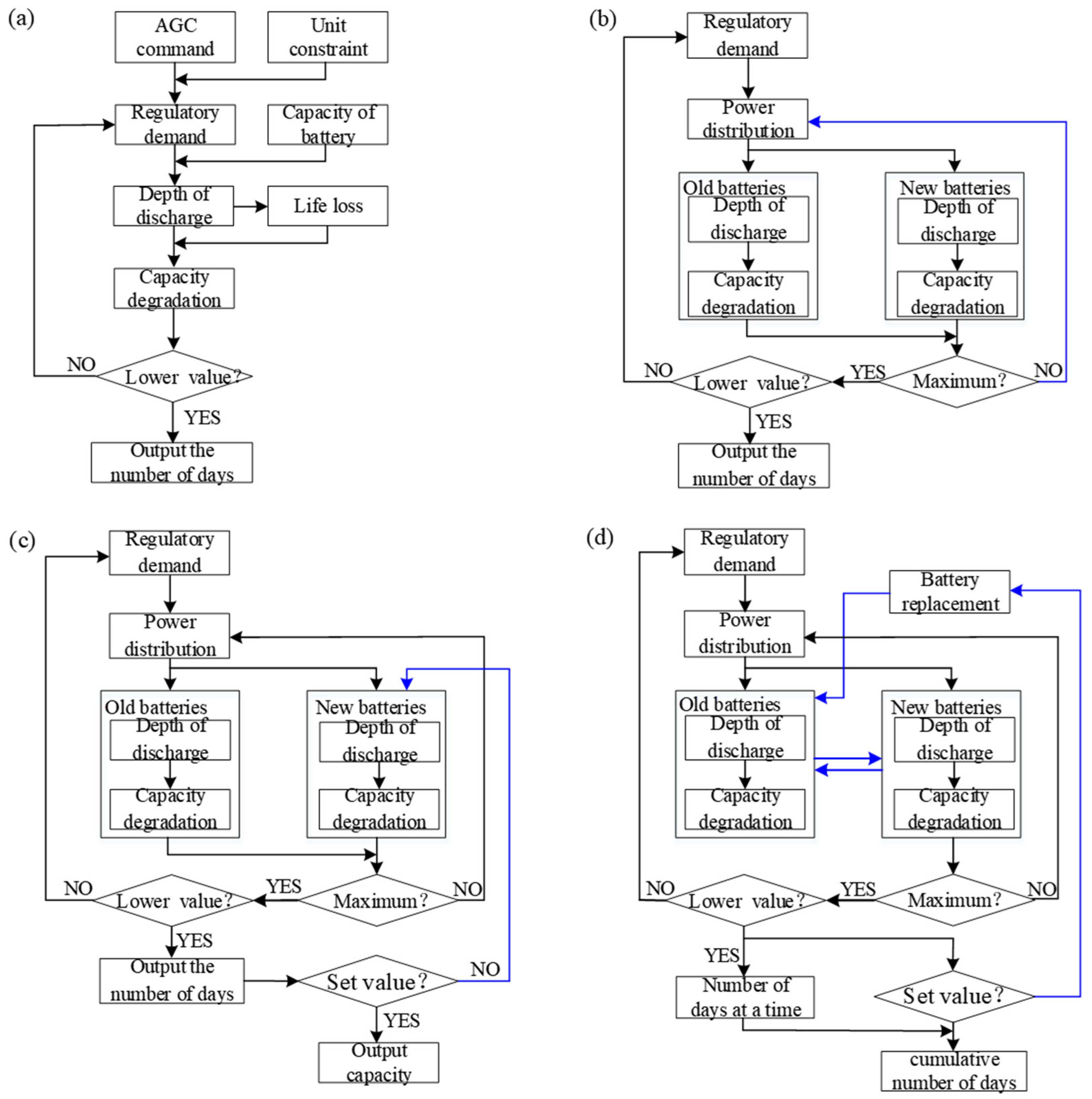 - A case analysis of both the equal-day replacement strategy and equal-capacity replacement strategy showed that the advantage of the replacement strategy mainly lies in the deep mining process of the initial storage capacity. The battery replacement strategy proposed in this work provides effective parameters for economic evaluation and the optimization of battery auxiliary frequency modulation.