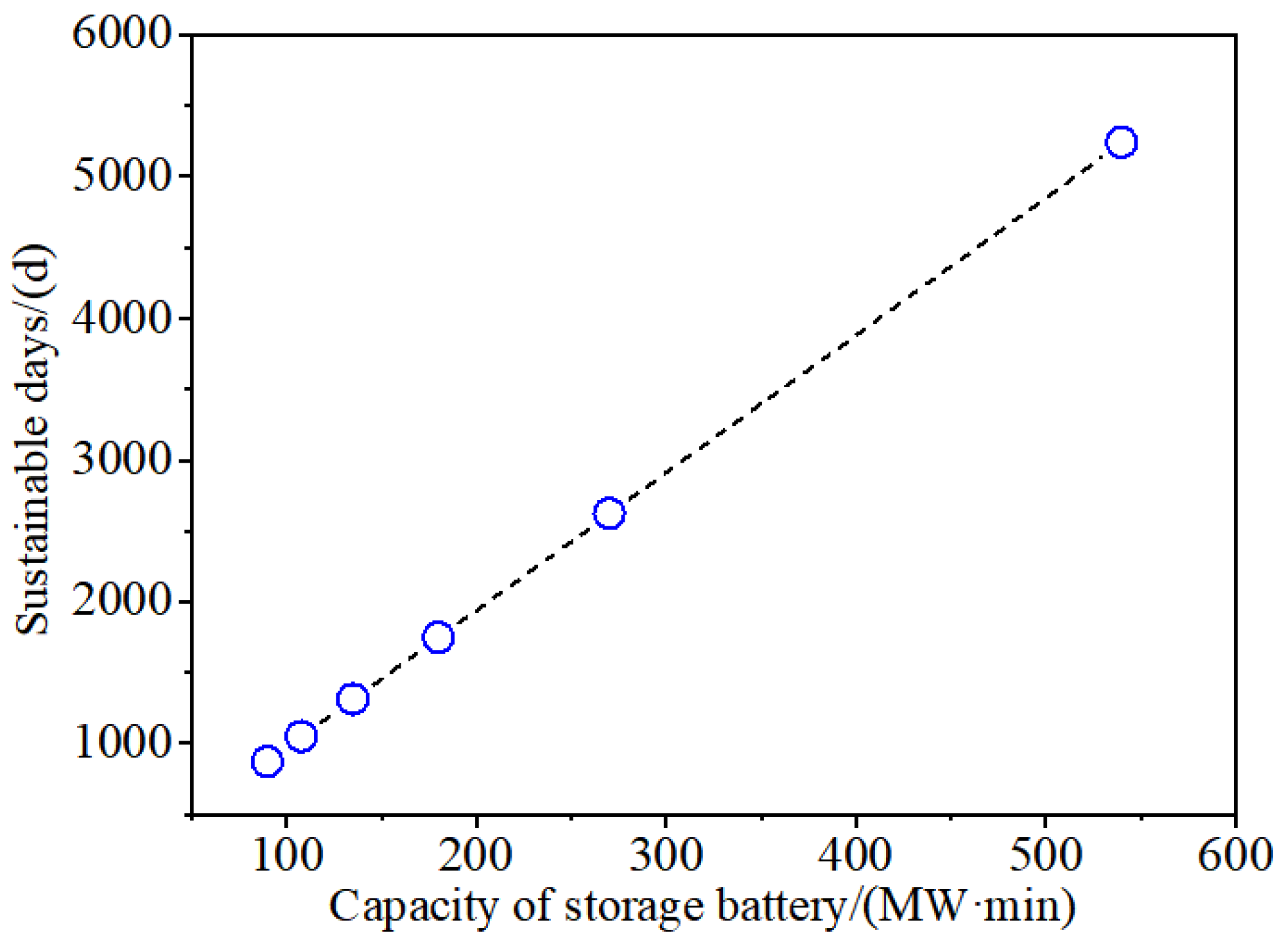 - The set capacity of the battery and the duration days are nearly linear, and the discharge depth of the battery is not obvious in the service life for this study.