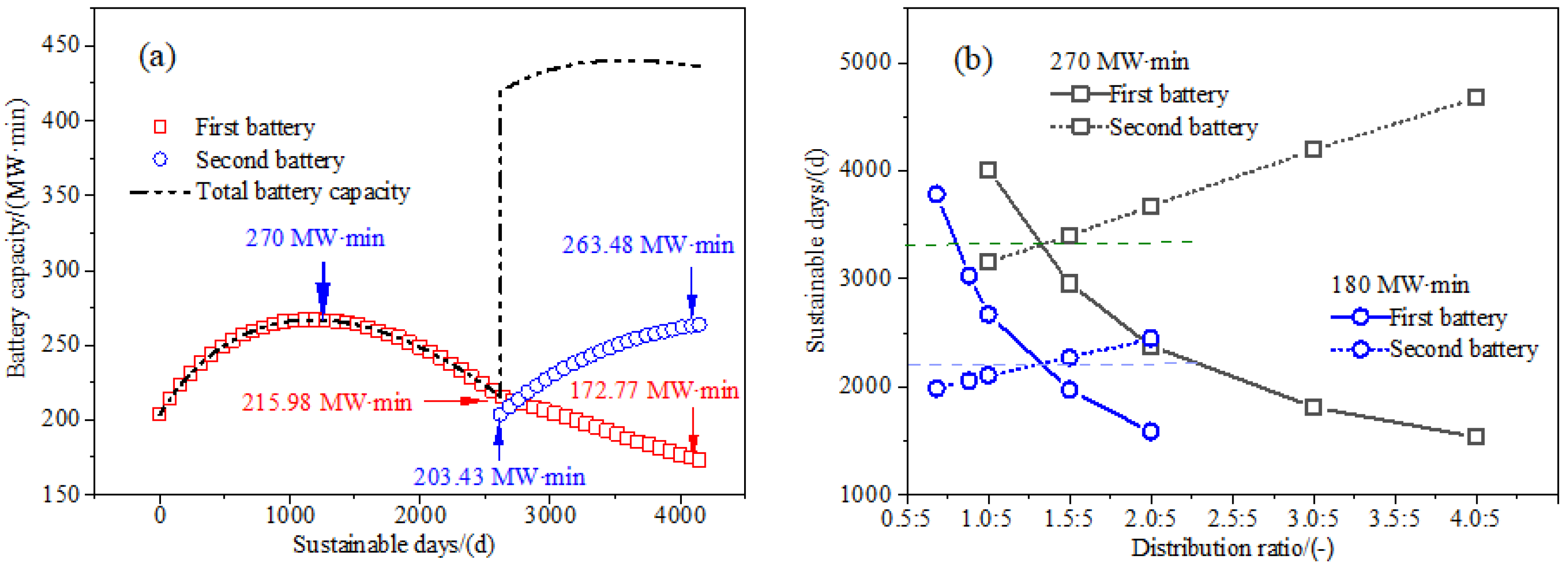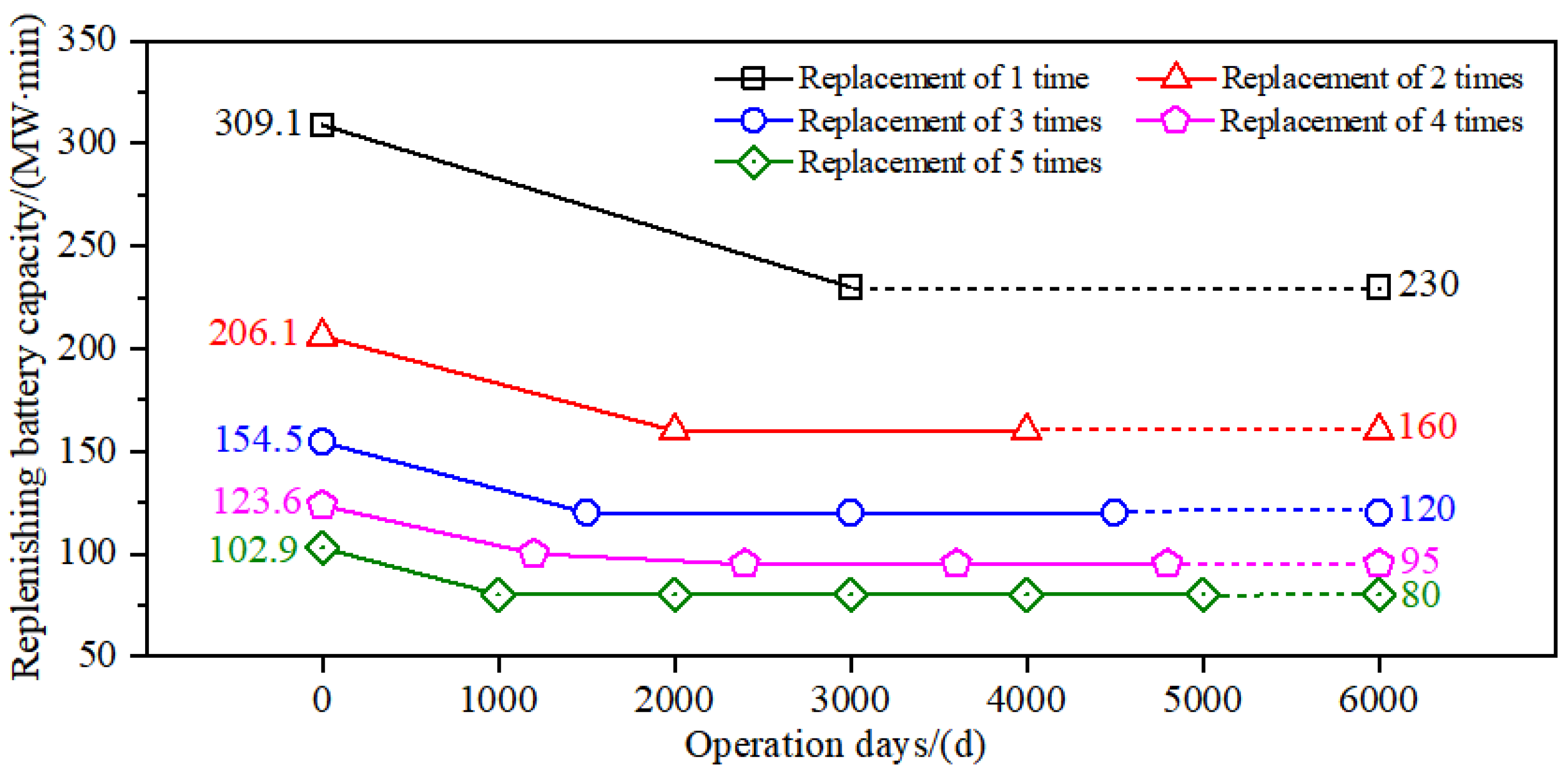 - In this calculation case, when the old and new batteries are coordinated to regulate the frequency, the duration time can be the same at the capacity allocation ratio of 1.3 to 5, which can meet the steady replacement demand of batteries. Increasing the replacement times is conducive to extending the duration of the battery; at the same time, the two batteries should always work under this strategy when the old and new batteries are being replaced steadily.