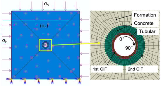 In-situ stress magnitudes were derived from well-log interpretations, yielding maximum horizontal, minimum horizontal, and vertical stresses of 61.07 MPa, 53.66 MPa, and 64.82 MPa, respectively. These values were applied as initial stress conditions within the formation using ABAQUS’s predefined field option [25]. The bottom surface of the formation was fixed, and normal displacements were constrained on the remaining surfaces. During the fracturing simulation, internal pressures ranging from 40 to 120 MPa were incrementally applied to the inner surface of the casing. The surface-to-surface contact was defined between the casing and cement sheath, as well as between the cement sheath and the formation. A friction coefficient of 0.6 was adopted for both interfaces to simulate the realistic contact conditions [16,23,25]. The FEA model was discretized using structured eight-node hexahedral elements (C3D8). A graded meshing strategy was employed, following the principle that the highest mesh density is at the casing and coarser elements gradually grow outward. The FEM model of the formation-cement sheath-casing assembly and its mesh division are shown in Figure 2.