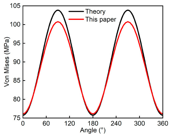 To verify the correctness of the finite element model, this paper considered the casing-cement sheath-formation (without cement defects). Following the analytical procedures widely reported in the literature [17,26,27,28,29], this paper established a mechanical model of the casing-cement sheath-formation system under the non-uniform stress field. According to the non-uniform stress field and boundary conditions in Section 3, the casing stress under the ideal scenario was calculated.