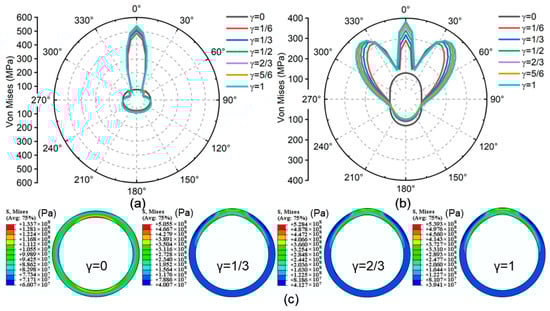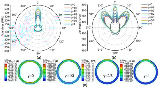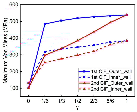 Figure 4 and Figure 5 show the casing stress for varying at the first CIF and second CIF. It can be observed that once the cement sheath defect occurs, there is a stress concentration phenomenon on the outer wall of the casing at the location of the missing cement sheath, while the inner wall exhibits stress concentration both at the location of the defects and at the junction of the missing cement sheath. Furthermore, when γ is relatively small, the maximum stress on the inner wall is located at the defect site. Whereas γ gradually increases, the location of maximum stress on the inner wall gradually shifts toward the junction of the cement sheath defects.