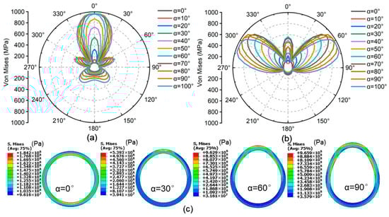 Stress distribution of casing under different missing angles: (a) Von Mises on the outer wall; (b) Von Mises on the inner wall; (c) Deformation contour (magnified ten times).