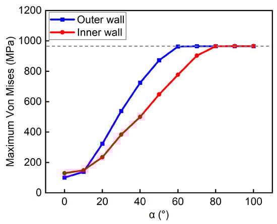 Figure 8 presents the curves of maximum stress on the inner and outer walls of the casing under different defect angles. As α increases from 0° to 100°, the casing stress initially increases and then tends to stabilize. This indicates that poor cementing quality can lead to defects, which worsen the stress condition of the casing and increase the risk of stress-induced failure. Notably, when α does not exceed 10°, the stress on the inner surface is greater than that on the outer surface, but the stress levels remain relatively close to those under the no-defect condition. Once α exceeds 10°, the stresses on both the inner and outer surfaces increase rapidly, with the outer surface stress surpassing the inner surface stress. When α exceeds 60°, the maximum stress on the outer surface no longer increases significantly and reaches the yield strength of the TP140V casing, 965 MPa. After α exceeds 80°, the maximum stress on the inner surface also does not change significantly, reaching the yield strength. The above trend demonstrates that as α increases, the outer wall of the casing first reaches the yield strength of the casing, and therefore undergoes strength failure earlier.