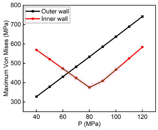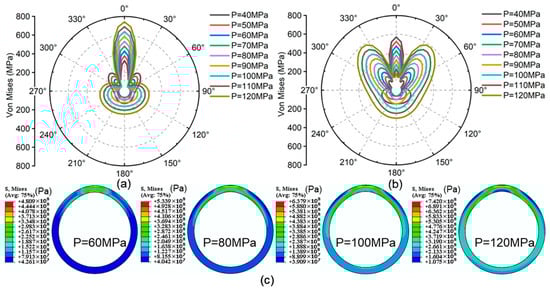 After cementing operations are completed, high-pressure fluid is typically pumped into the formation to perform volumetric fracturing, which correspondingly alters the internal pressure of the casing. According to the limits of internal pressure of field conditions, the internal pressure can change from 40 MPa to 120 MPa. Therefore, this section examines the influence of internal pressure on casing stress under the condition of γ = 1 and α = 30°.