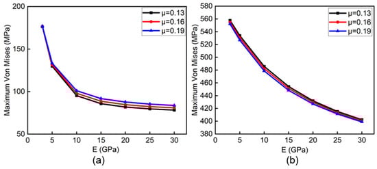 As illustrated in Figure 11, when the cement sheath is perfectly intact, the casing stress decreases progressively as the elastic modulus of the cement (E) increases. This occurs because a higher elastic modulus can enhance the collapse resistance of the cement sheath, allowing it to absorb more stress from the casing. The radial deformation of the cement sheath therefore becomes smaller, its shielding effect on the casing is enhanced, and the assembly can better resist external formation loading. For instance, at a Poisson’s ratio of 0.16, when the elastic modulus E increases from 3 GPa to 30 GPa, the maximum casing stress decreases by 98 MPa. Under the condition of γ = 1, α = 30°, the maximum stress of the casing is similar to that in the intact case. When the Poisson’s ratio is 0.16, the same increase in modulus increment (3 GPa to 30 GPa) now reduces the peak casing stress by 153 MPa—an even larger reduction than in the intact case. Thus, a high-modulus cement is comparatively more beneficial when the cement sheath is present. When the elastic modulus is constant, varying the Poisson’s ratio has a minimal effect on casing stress. For example, when the elastic modulus is 20 GPa, adjusting the Poisson’s ratio from 0.13 to 0.19 can reduce the maximum casing stress by only 3.4 MPa. Therefore, during cementing operations, it is advisable to utilize cement with a relatively low Poisson’s ratio, while excessive emphasis on optimizing the Poisson’s ratio performance is not necessary.