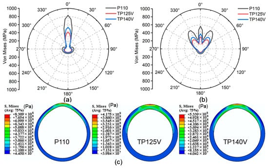 As shown in Figure 12, the stress change law of the casing is as follows: TP125V < TP140V < P110. Under the existing engineering parameters, the maximum stresses are 831 MPa for P110, 417 MPa for TP125V, and 493 MPa for TP140V. The maximum stress in the TP125V is therefore 414 MPa lower than in P110 and 76 MPa lower than in TP140V. This demonstrates that, for the same material properties, the larger the casing wall thickness, the less stress the casing is subjected to, and the less impact of cementing quality on the casing safety. This can be attributed to the fact that greater wall thickness can enhance casing stiffness and improve resistance to external loads, thereby reducing stress concentrations.