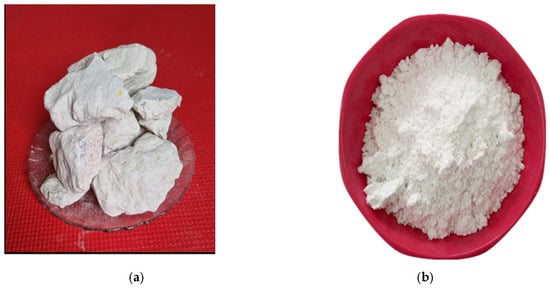 We obtained two different kinds of raw kaolin from the western desert of Al-Anbar, Iraq: red (KR) and white (KW), Figure 3a and Figure 4a To prepare them for more processing, the kaolin samples were first crushed and sieved to ensure that all the particles were the same size, which was approximately around 100 μm. We used hydrochloric acid (HCl, 37% purity) from Thomas Baker, India, in the acid leaching step to change the surface and structure of the kaolin materials. E.Merck, Darmstadt, Germany, provided cerium (III) nitrate hexahydrate (Ce (NO3)3·6H2O, 98.5% purity), which was used to make cerium for catalyst preparation. Along with these chemicals, a number of laboratory tools were used during the experiments. These included a precision-controlled furnace that heated kaolin to 800 °C, beakers, and a magnetic stirrer-heater with a magnetic bar, a ceramic eyelid, a condenser for vapor condensation, and a sensitive digital balance. We used a programmable temperature controller (model TFY4-M2 A) to manage the temperature during important steps. It took in TC/RTD/mV/Rt and had a power supply of AC/DC 100–240 V. This ensured that the temperature stayed the same during the calcination and catalytic preparation steps.