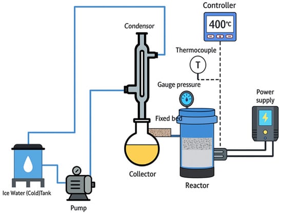 The reactor (fixed-bed, stainless steel, and batch) (Figure 5) commenced testing the fabricated catalyst (MKA800 + Ce (20%) in the materials lab at the University of Technology-Iraq at three distinct temperatures: 350 °C, 400 °C, and 450 °C.