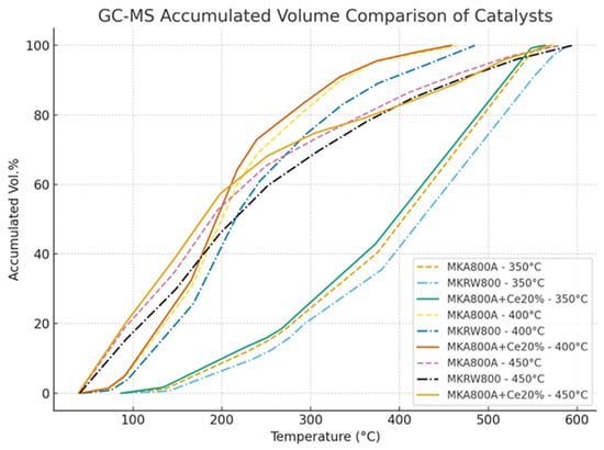 All results of three kinds of catalysts are presented in Figure 6 below, which also shows that the MKA800A+Ce 20% catalyst gives the best performance, reaching higher accumulated volumes at lower temperatures than both MKA800A and MKRW800. At 400–450 °C, the Ce-modified catalyst converts heavy fractions more effectively, while the others progress more slowly.