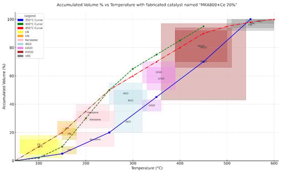 The colors on the curves in Figure 7 clearly show how the MKA800+Ce20% catalyst changes with temperature and how the hydrocarbon cuts are spread out. The blue curve (350 °C) shows a slower conversion process with a gradual increase in accumulated volume. At higher temperatures, it mostly produces heavier fractions (HVGO and VRC), as seen by the bigger shaded dark-red and gray sections. The green curve (400 °C) has a steeper slope, which means that cracking is more effective and more middle distillates (AGO and LVGO) are produced. The light blue and pink shaded areas demonstrate this. The red curve (450 °C) is the steepest, showing the maximum conversion rate and the dominance of light fractions (LN, HN, and kerosene). The yellow, orange, and red bands at lower temperatures show where these fractions are most common. These areas, which are color-coded, match the data in Table 5. They show that higher temperatures move the product spectrum toward lighter fractions because catalytic cracking works better and cerium’s redox phases are fully activated [21,24].