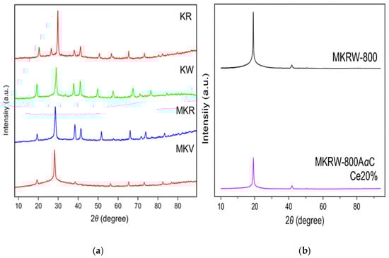 XRD for (a) (KR, KW) and (MKR800, MKW 800), (b) MKRW800 A, MKRW800A@ Ce 20%.