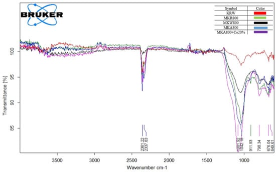 Figure 9 shows how the structure of kaolin changes over time as a result of thermal and chemical treatments, as shown by the FTIR spectra. The sharp and strong O–H stretching bands between 3695 and 3620 cm−1 and the clear Al–OH bending vibration near 910 cm−1 in the raw kaolin sample (KRW) show that there are well-ordered kaolinite layers and that the original crystalline structure is still there. When kaolin is heated to 800 °C, as seen in MKR800 and MKW800, these hydroxyl-related bands become weaker or disappear completely. This is because the kaolinite changes into an amorphous metakaolinite phase. The Si–O stretching bands also move from roughly 1114 cm−1 to lower wavenumbers (around 1001 cm−1) and become wider. This shows that the silicate network breaks down as the layered structure collapses during calcination [1].