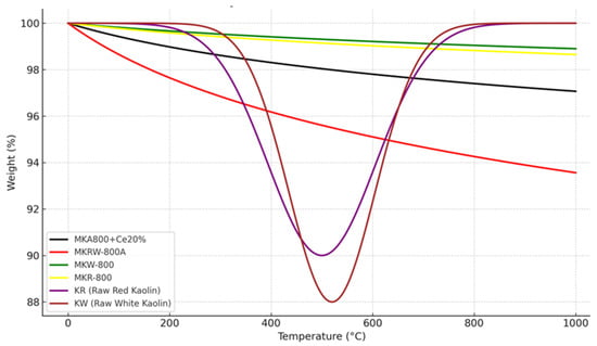 Figure 10 shows the thermogravimetric analysis (TGA) curves for raw kaolin (KR and KW), calcined kaolin (MKR-800 and MKW-800), acidified metakaolinite (MKRW-800A), and cerium-loaded metakaolinite (MKA800+Ce20%). These curves show that the thermal decomposition behaviors are different for each type of kaolin, depending on changes in structure and composition. The raw kaolin samples (KR and KW) lose a lot of weight between 400 and 650 °C. This is because kaolinite loses its hydroxyl groups and turns into metakaolinite. KR begins to dehydroxylate at a lower temperature than KW, meaning KR is less thermally stable and requires less energy for decomposition, most likely due to iron oxide impurities that promote early breakdown. A rigorous comparison of energy demand, however, should rely on kinetic analysis methods (such as Kissinger or Ozawa–Flynn–Wall) or DSC enthalpy rather than onset temperature alone. Our present data therefore indicate KR < KW in thermal stability for the main mass-loss step [37,38,39].