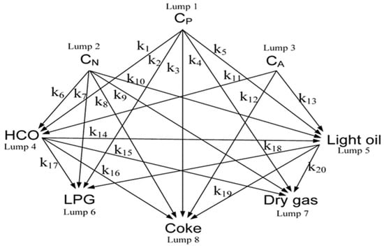 Kinetic modeling is essential for comprehending the mechanistic facets of catalytic cracking. Lumped kinetic models, such as four-lump and eight-lump frameworks, are commonly employed to streamline the intricate mixing of heavy oils and forecast product distributions across diverse operating conditions [7,8]. These kinds of models make it possible to determine reaction rate constants, activation energies, and product selectivity, which are important for designing reactors and testing catalysts.