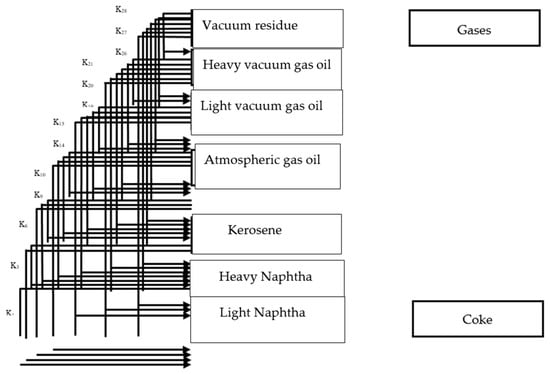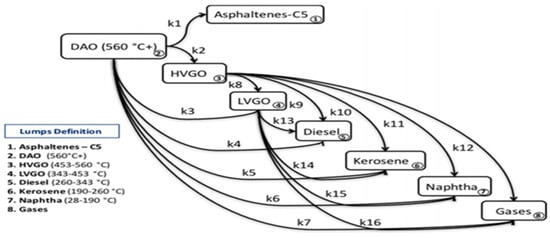 - Singh, J.; Kumar, M.; Saxena, A.K.; Kumar, S. Reaction pathways and product yields in mild thermal cracking of vacuum residues: A multi-lump kinetic model. Chem. Eng. J. 2005, 108, 239–248. [Google Scholar] [CrossRef]