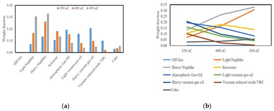 If the cracking process continues beyond 450 °C and reaches 500 °C, the product distribution shifts unfavorably. At 450 °C, the system is at its optimum: heavy residues are effectively converted, light fractions such as gasoline and kerosene are maximized, and coke formation is relatively low. Once the temperature rises further, the lighter fractions begin to undergo over-cracking, breaking into small gaseous molecules (C1–C4) instead of staying in the liquid range. At the same time, the higher energy favors aromatization and polycondensation reactions, which accelerate coke deposition on the catalyst surface, blocking its pores and reducing activity. Above this point, the process is driven more by thermal cracking than catalytic action, leading to lower selectivity and poorer liquid fuel yields. Studies show that while higher temperatures may increase overall conversion, they generally cause a decline in valuable liquid products and a sharp rise in gas and coke yields [20,23].