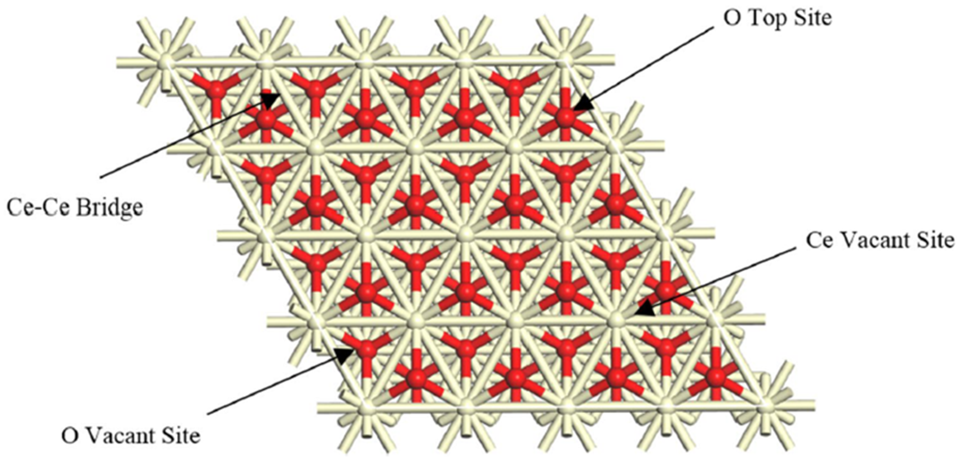 Figure 2 illustrates the adsorption sites for hydrogenation on the ceria surface as observed from a top–down perspective.
