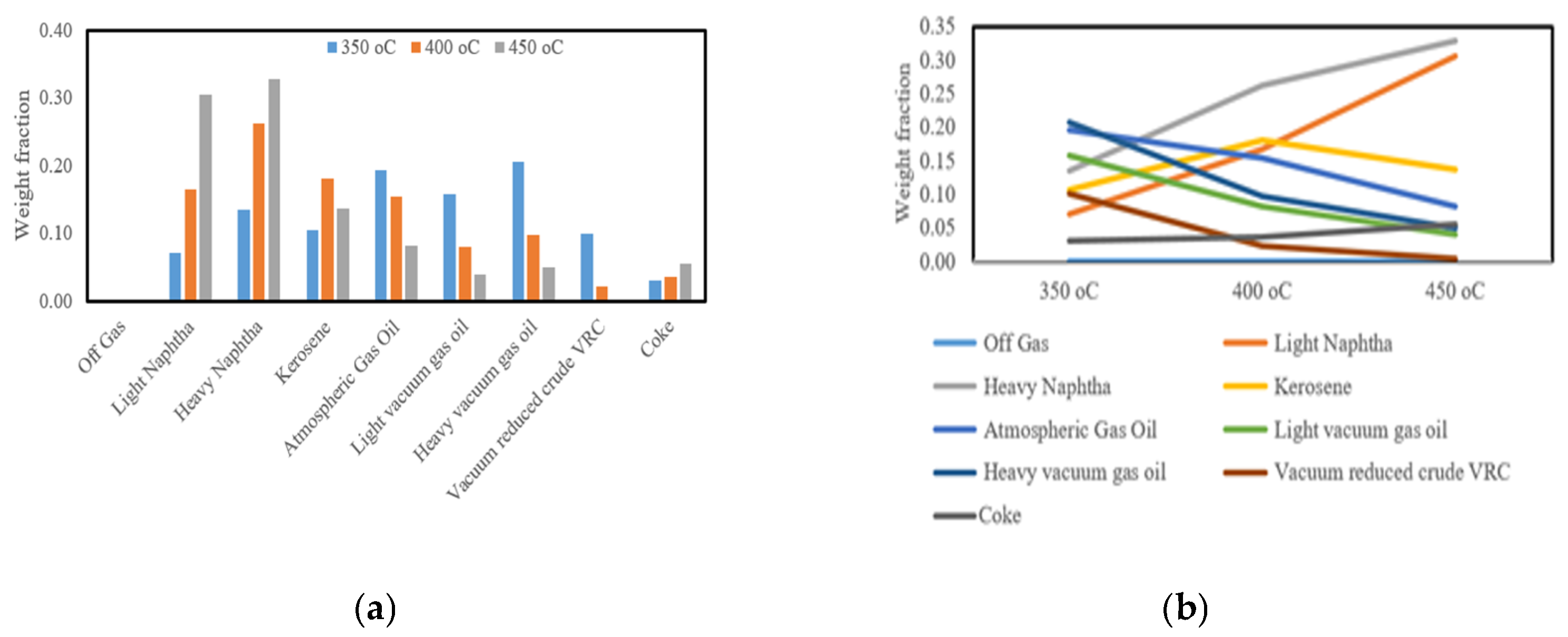 Figure 15 illustrates the influence of temperature on product distribution during vacuum residue cracking. As the reaction temperature increases from 350 °C to 450 °C, the formation of light products such as light and heavy naphtha becomes more pronounced, while kerosene and atmospheric gas oil fractions gradually decline. At higher temperatures, off-gas yields also rise significantly, reflecting deeper molecular scission and enhanced conversion of heavier hydrocarbons into lighter fragments. Coke yield, although relatively small, shows a slight increase at 450 °C, indicating the growing role of condensation and polyaromatic stability under severe conditions. These results highlight the balance between promoting liquid fuel generation and avoiding over-cracking into gas and coke, a behavior consistent with recent findings on residue pyrolysis and cracking kinetics [