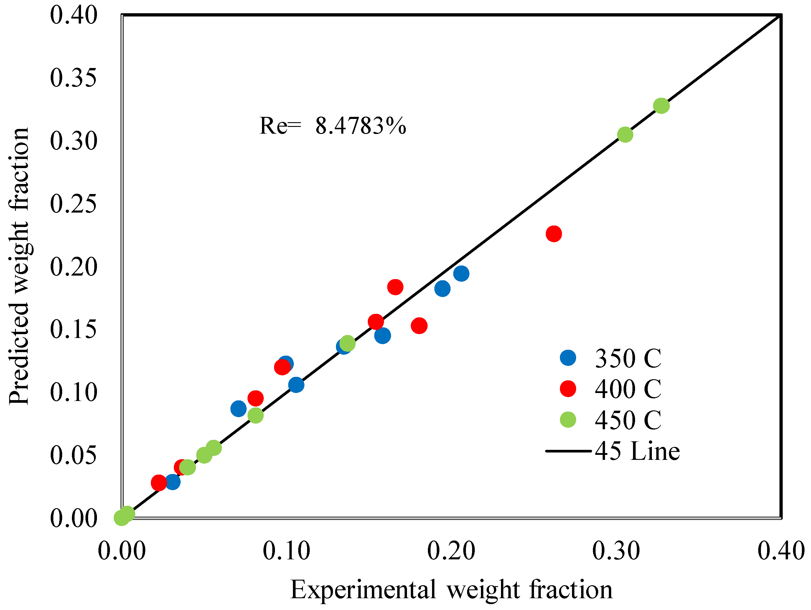 Table 10 shows the comparison between experimental and predicted weight percent of cracking products at different temperatures. The kinetic model shows an adequate depiction of the experimental results. The input data covered a wide range of operating variables, which led to a moderate mean relative error (MRE) of 9.64% and mean absolute error (MAE) of 0.015052, as in Table 12 below.