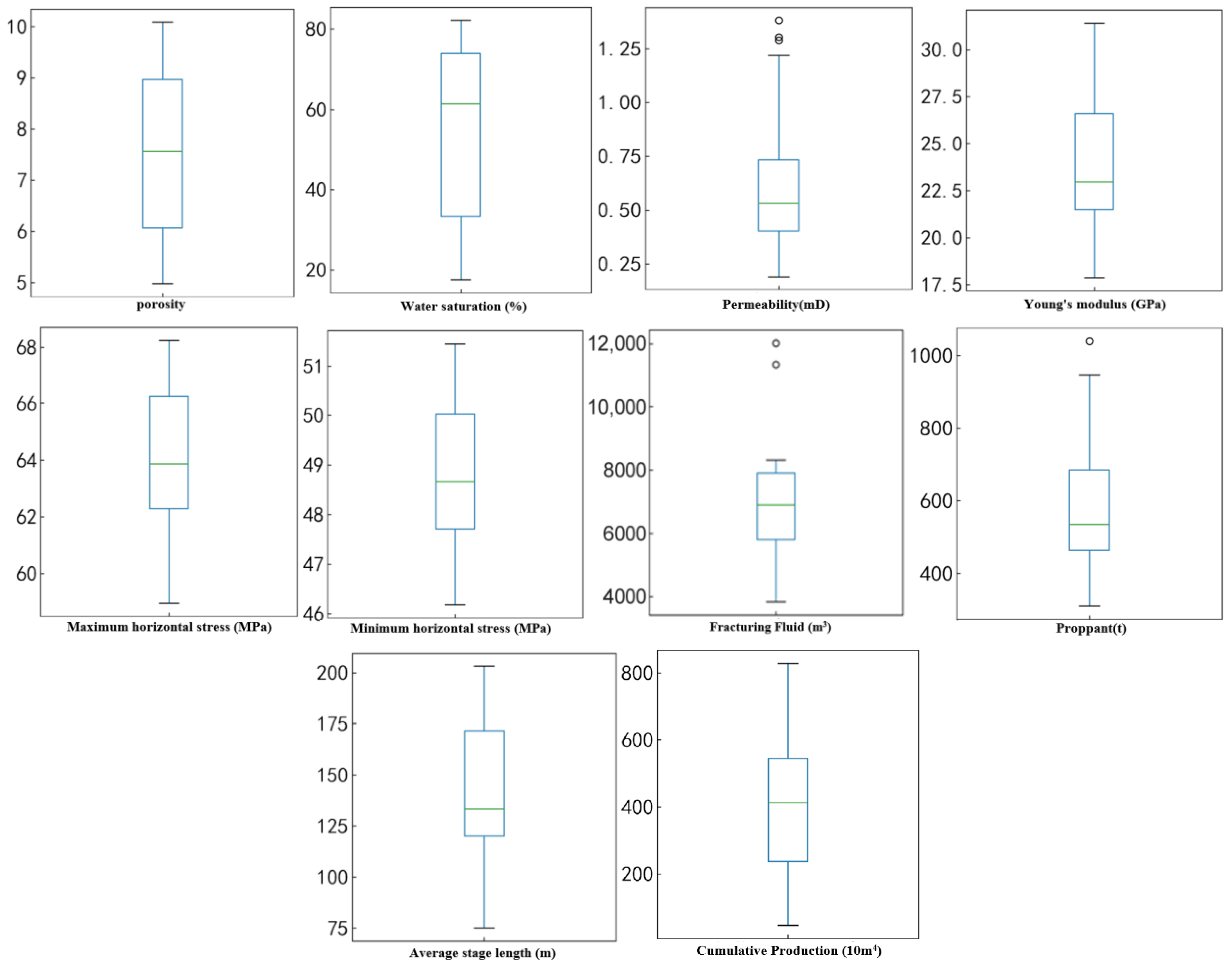 Outliers are evident in permeability and treatment volumes, indicating operational disturbances and measurement noise characteristic of tight-gas projects.