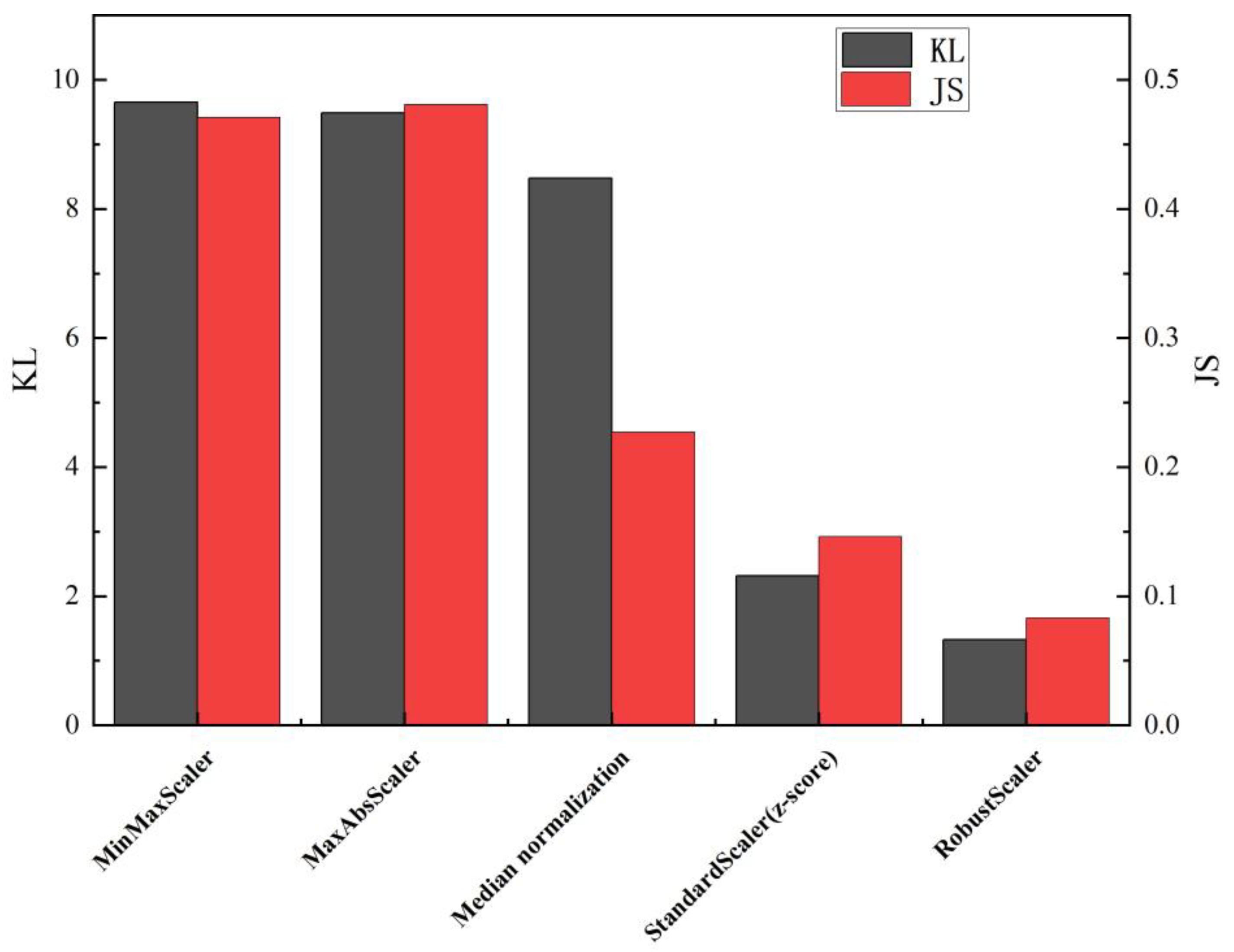 We assessed five normalizing methods frequently employed in petroleum production datasets—MinMaxScaler, MaxAbsScaler, StandardScaler (z-score), RobustScaler (median–IQR), and median normalization—and measured their impacts utilizing divergence measures.