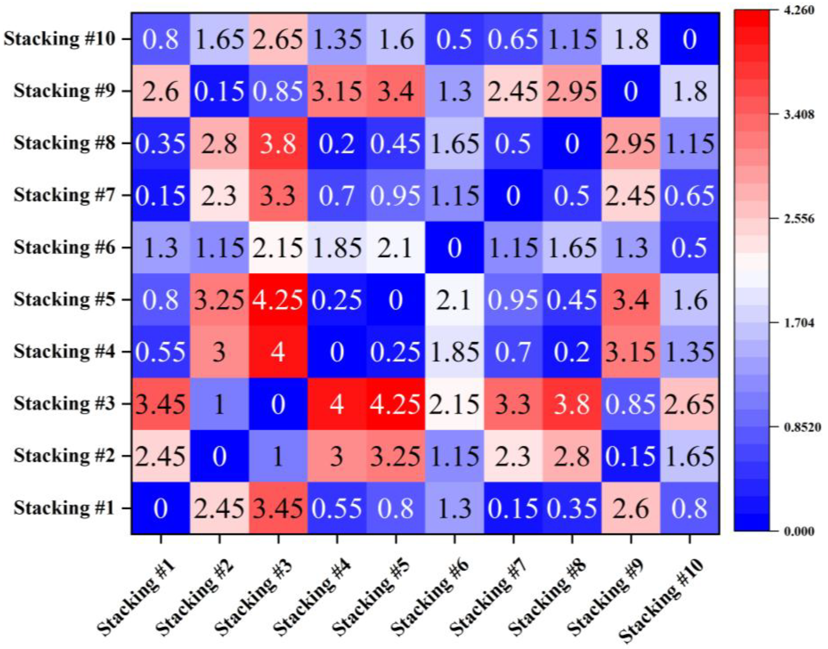 For α = 0.05, = 3.173, post hoc Nemenyi analysis indicates that the top performer (Stacking #3; average rank 2.95) is statistically indistinguishable from Stacking #9, #2, #6, and #10, whereas others are significantly worse (α = 0.05, CD = 3.173).