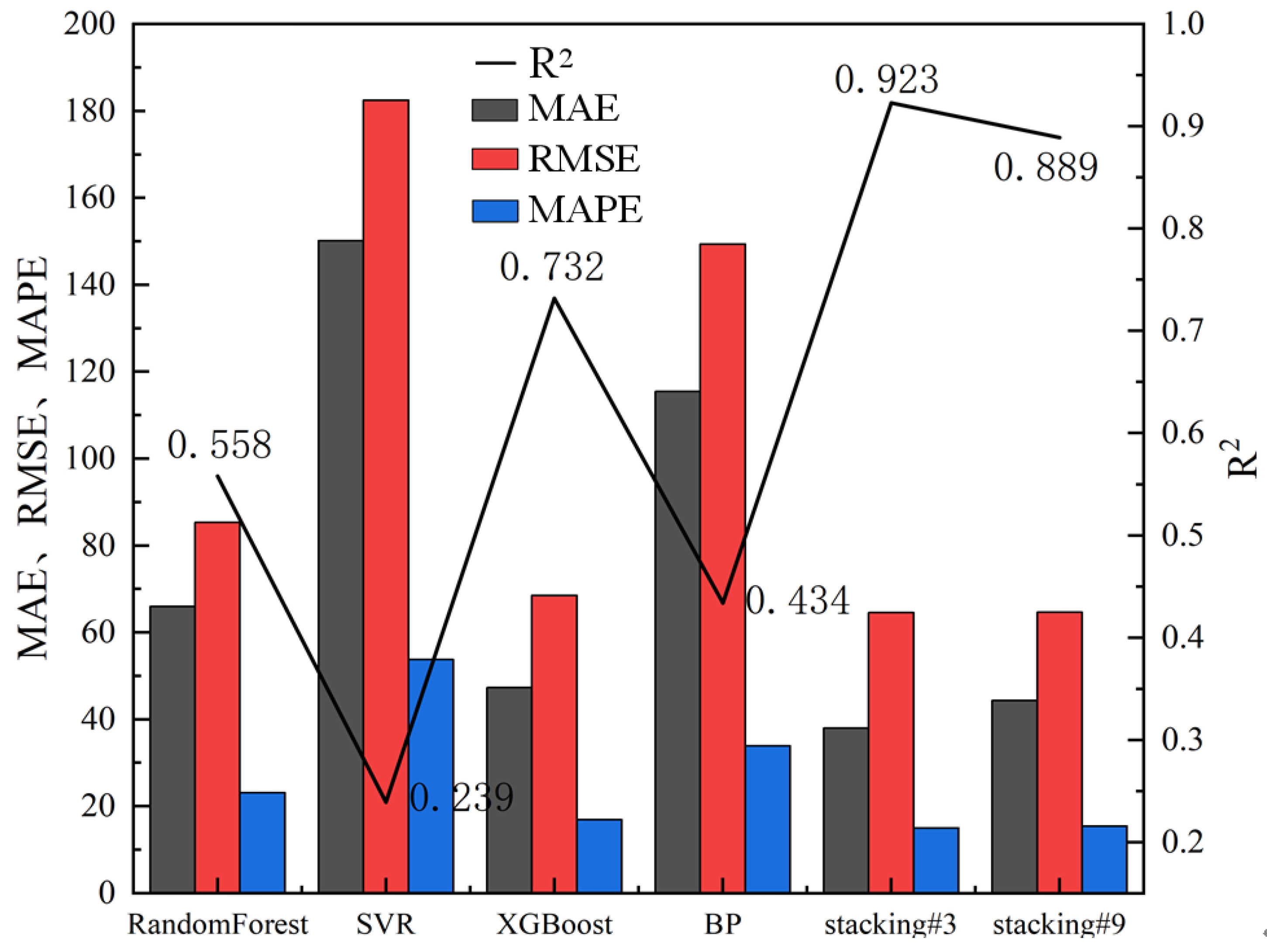 Figure 9. Both ensemble models use SVR as the meta-learner, and Stacking #3 specifically selects the base learner, while Stacking 9 includes all the base learners involved in this paper. As shown in the figure, the root mean square error (RMSE), absolute error (MAE), and mean absolute percentage error (MAPE) of Stacking #3 and Stacking #9 are significantly lower than those of individual machine learning models. In addition, the R