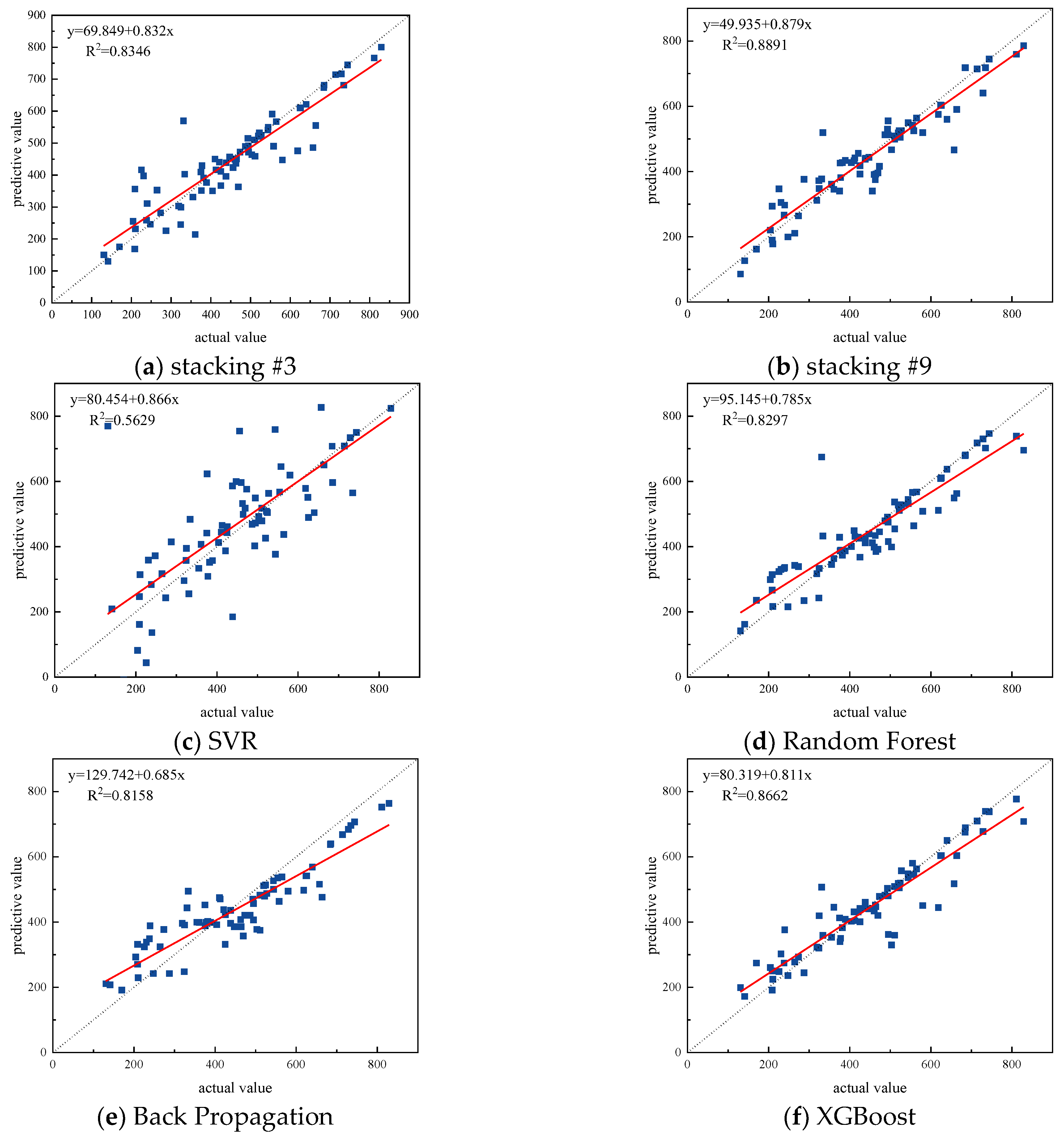 Figure 10 illustrates the comparison between the anticipated values and the actual values derived from two distinct models. The figure clearly illustrates that the projected values of Stacking #3 and Stacking #9 in the test set are more closely aligned with the fitted line of y = x, but the fitted lines of individual machine learning models exhibit considerable deviation from y = x. This suggests that stacking ensemble models can proficiently rectify prediction biases introduced by individual machine learning models.