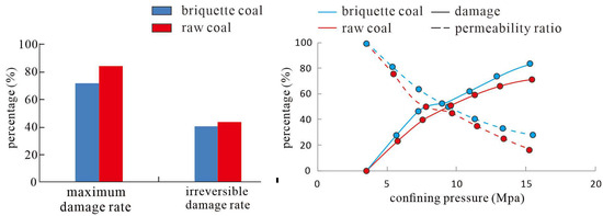 - The critical conditions for rate sensitivity and water sensitivity are dominated by microstructure. Rate sensitivity: the critical flow rate of raw coal is lower than that of briquette coal, as damage in raw coal originates from mineral detachment, while in briquette coal, it comes from particle displacement. Water sensitivity: raw coal experiences zero permeability due to fracture closure under low pressure, while the damage rate under high pressure is similar to that of briquette coal. This indicates that flow rate should be controlled in the early stages of production to avoid low-pressure-induced water lock damage.