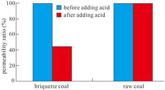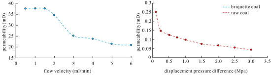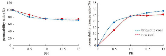 - The trends of permeability ratios and permeability damage rates of molded coal and raw coal samples with varying pH values are basically consistent (Figure 10).