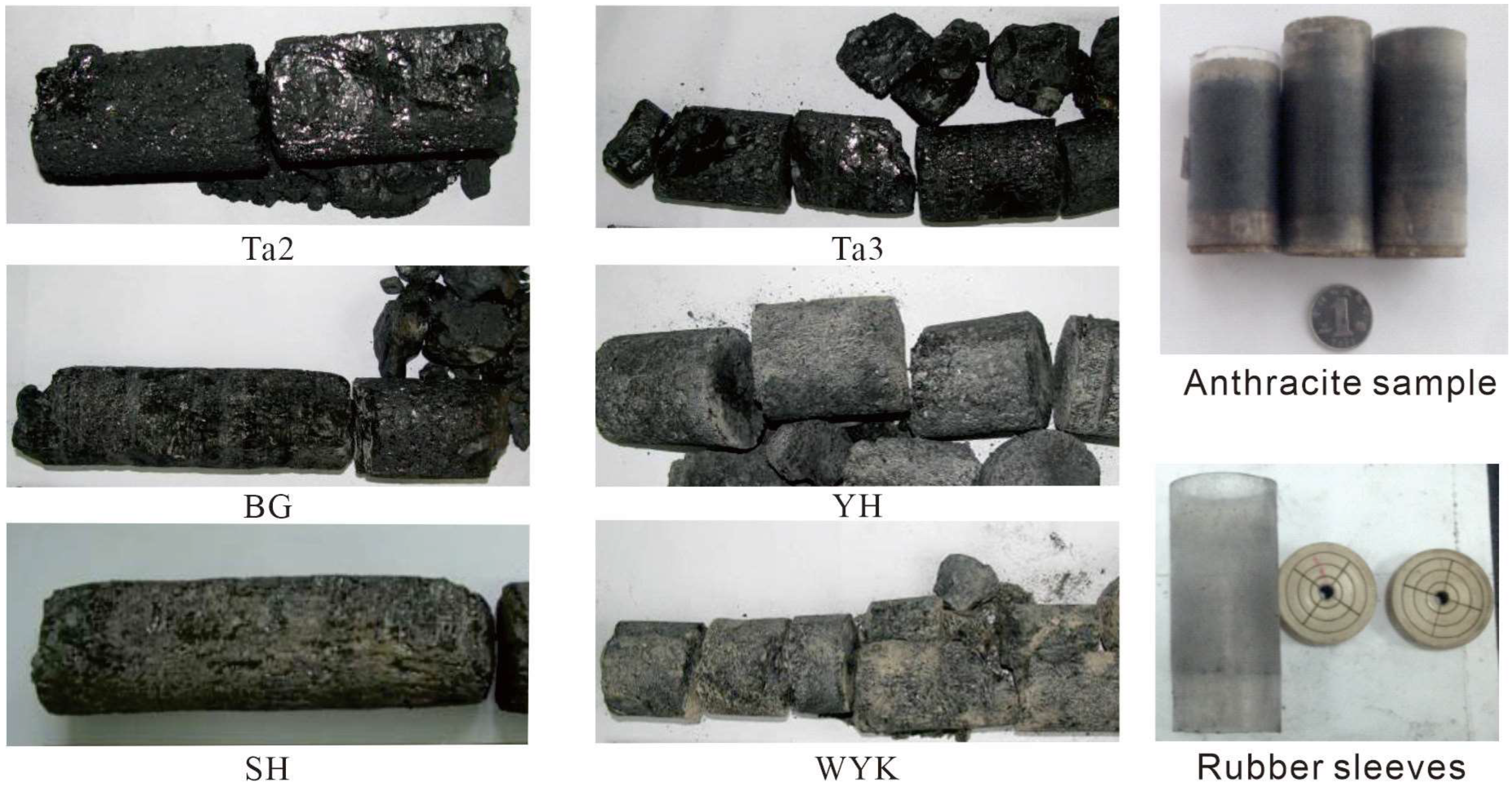 The coal rock types of the southern part of the Qinshui Basin in the Permian period are mainly semi-bright coal and semi-dark coal. The instrument was produced by Beijing Weiyan Technology Co., Ltd. in Beijing, China. The microscopic components are mainly the vitrinite group, followed by the inertinite group, and the chemoite group is relatively rare [22]. Therefore, the samples in this study were all taken from six different coal mines in the southern part of the Qinshui Basin in China, the Permian Shanxi Formation coal seam, and the coal types are mainly semi-bright type and bright type. The raw coal samples were made into cylinders with a diameter of 2.5 cm and a length of 3.0 to 5.0 cm, with both ends perpendicular to the axis.