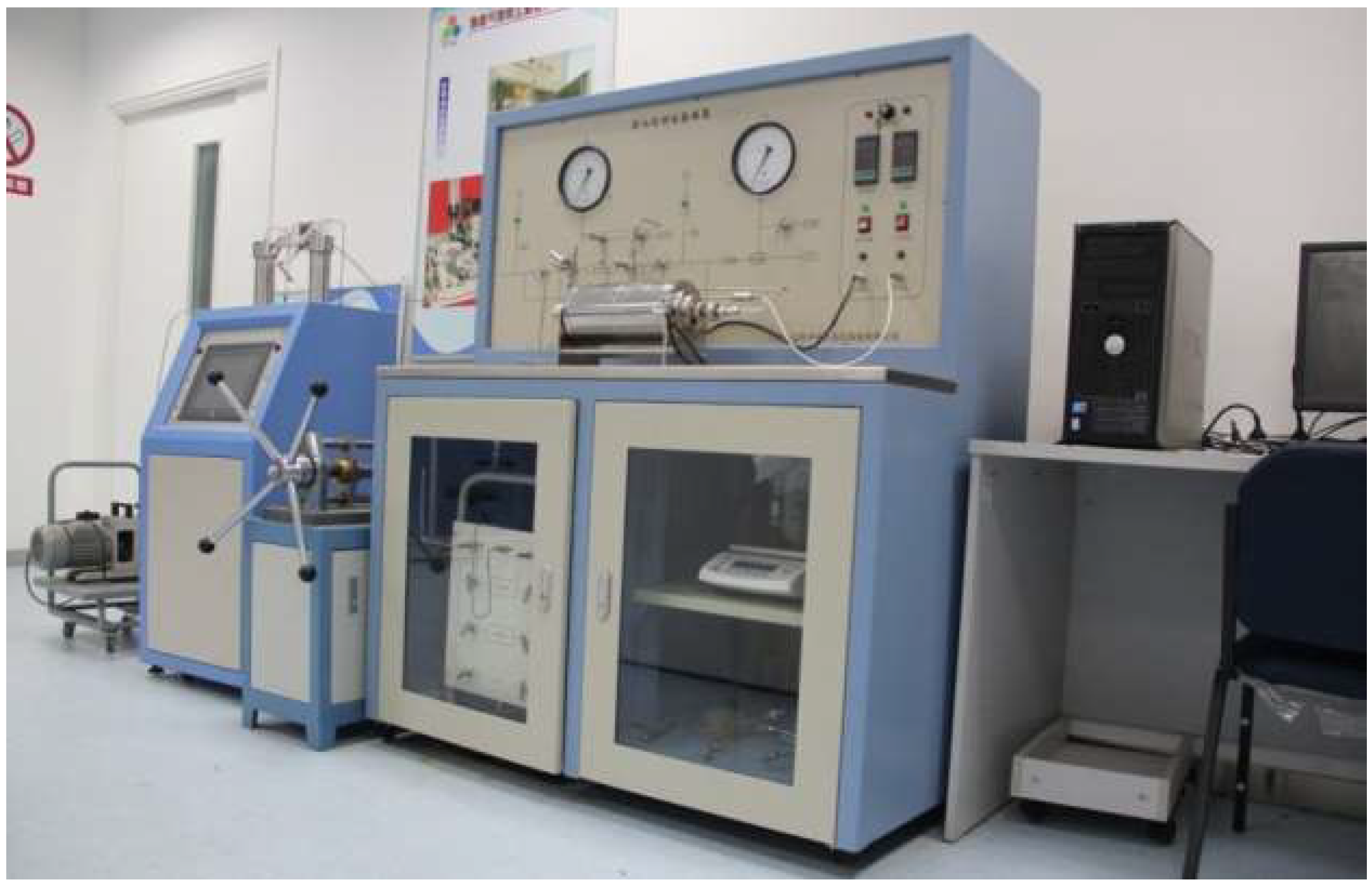 The rock sensitivity test was conducted at the Beijing Key Laboratory of Non-conventional Natural Gas Energy Geology Evaluation and Development Engineering of China University of Geosciences (Beijing). The instrument parameters are as follows: working pressure: 50 MPa, pressure test accuracy: 0.1% F·S, flow range: 0.01–12 mL/min, working temperature: 180 °C, temperature control accuracy: ±1 °C, power supply: AC 380 V, 50 Hz, total power: 8 Kw (Figure 2).