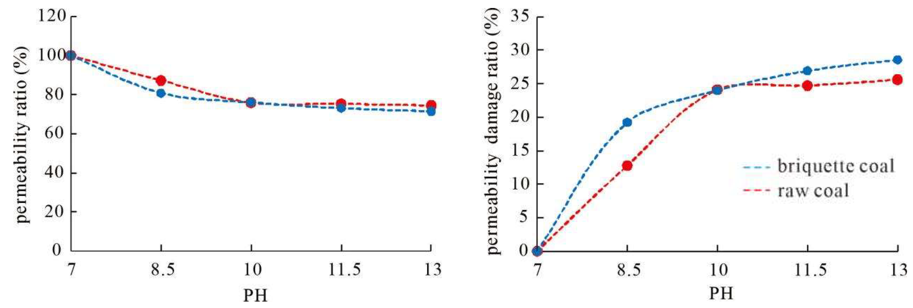 In the experiment, the confining pressure and liquid flow rate of the coal sample were kept constant, and the changes in permeability caused by different alkaline fluids passing through the coal sample were determined by altering the properties of the alkaline fluid.