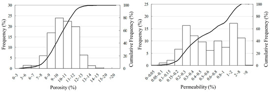 Distribution of porosity and permeability of reservoir cores in the study area.