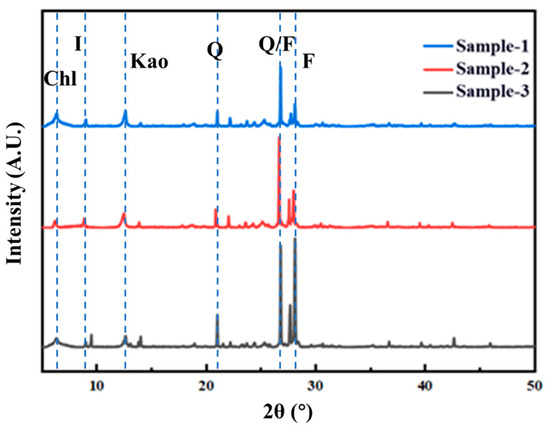 X-ray diffraction (XRD) patterns were obtained using an X-ray diffractometer (EMPYREAN, Malvern Panalytical B.V., Almelo, The Netherlands). The XRD results of clay and non-clay minerals in the reservoir rocks are shown in Figure 2. Three sets of core samples were selected for analysis. The positions of the diffraction peaks were largely consistent across the samples, indicating a high degree of similarity in mineral composition. Feldspar was the dominant mineral component (46.7%), followed by quartz (22.1%). The total clay mineral content was 22.4%, with chlorite being the most abundant (53.0%), followed by kaolinite (22.0%), illite (6.7%), and mixed-layer illite/smectite (18.3%).