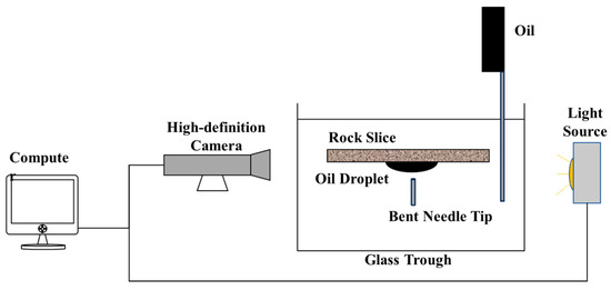 The experimental setup is illustrated in Figure 4. Selected core slices were polished using sandpaper to minimize the influence of surface roughness on wettability. The slices were then cleaned using a Soxhlet extractor. To achieve ionic equilibrium, the samples were first saturated with FW at 70 °C for one week [34,39]. Subsequently, the slices were aged in crude oil at 70 °C for approximately four weeks to establish a stable oil-wet condition. The initial wettability (θ0 was recorded. After aging, the core slices were cleaned and dried, then immersed in brine solutions of different salinities. The samples were treated in a vacuum oven at 70 °C for 7 days to ensure thorough interaction with the solutions. A contact angle measuring instrument (SD200, Shengding Precision Instrument Co., Ltd., Dongguan, China) was used to assess wettability alteration. A 30 μL droplet of crude oil was placed on the surface of the core slice and centered under the camera. Contact angles were recorded over a duration of 600 min at both 30 °C and 70 °C. Each test was repeated 2–3 times, and the average was taken to minimize deviations caused by local mineralogical differences. The wettability alteration index (WAI) was calculated using the following Equation (3):